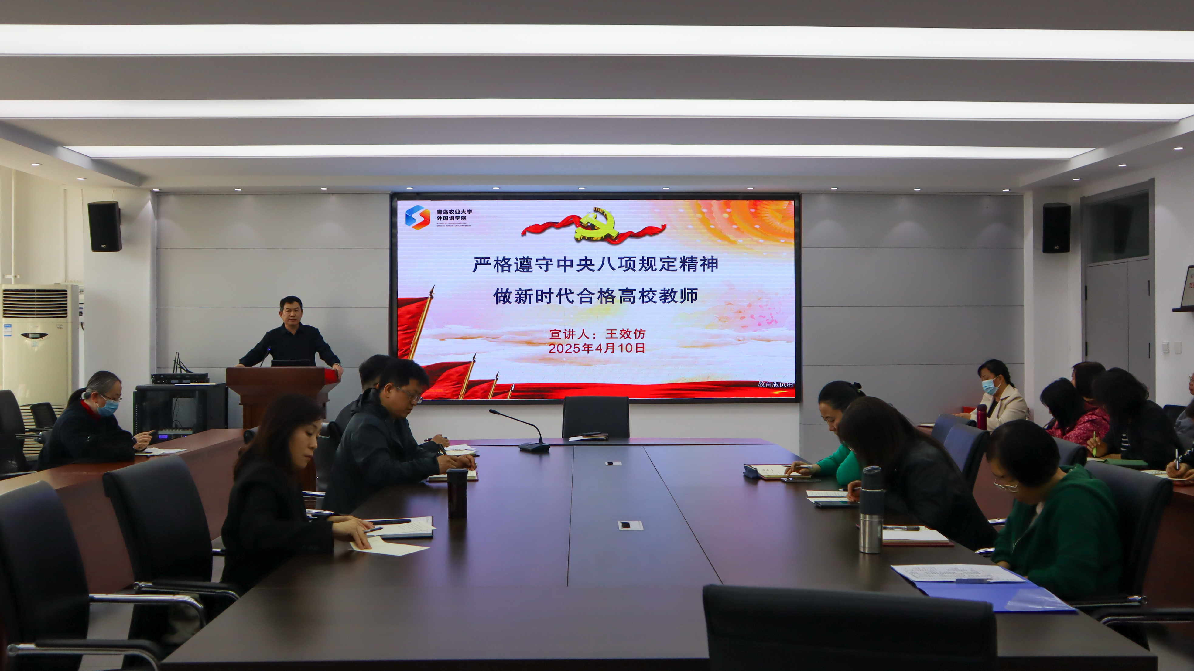 4月10日,beat365亚洲体育官方网站在文经楼会议室组织深入贯彻中央八项规定精神学习教育专题学习。公司党委书记王效仿以《严格遵守中央八项规定精神 做新时代合格高校教师》为题讲授专题党课,全体教职工参加学习。