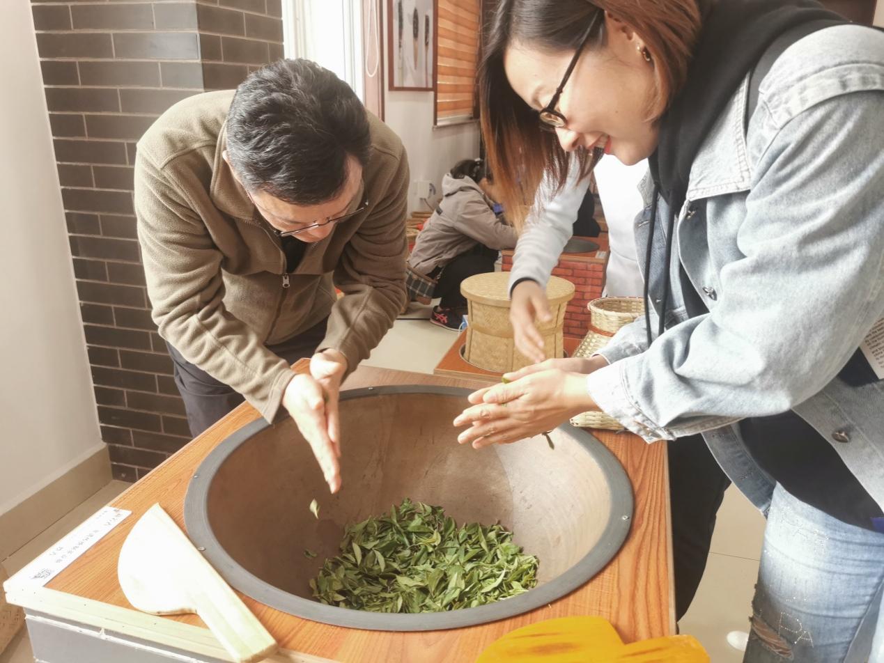随后,全体党员前往茶田花海游览区进行采茶体验活动。鳌角石村地形多以山地丘陵为主,因不适宜种植庄稼,村民经济来源狭窄,村里一度贫困落后。而该游览区是鳌山卫党工委、办事处依托天柱山登山旅游的优势,将鳌角石村茶叶种植与乡村旅游业进行有机结合后的代表性区域,村庄最终走出了一条富有地方特色的发展之路。体验活动结束后,党员们去往青岛鳌福茶厂进行考察调研。鳌福茶厂是在党工委、办事处的指导、支持下,村庄成立的农产品加工龙头企业,它的设立标志着该村在打造党建引领乡村振兴、创新城乡融合发展机制的“齐鲁样板”中率先迈出了新步伐。
