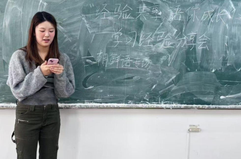 在朝鲜语学习经验交流会上,周子珍首先为大一员工介绍基础韩国语知识框架,剖析学习重点难点;接着又面向大二大三员工分享韩国语高阶学习方法、中韩互译技巧等,解决专业学习中的实际问题。