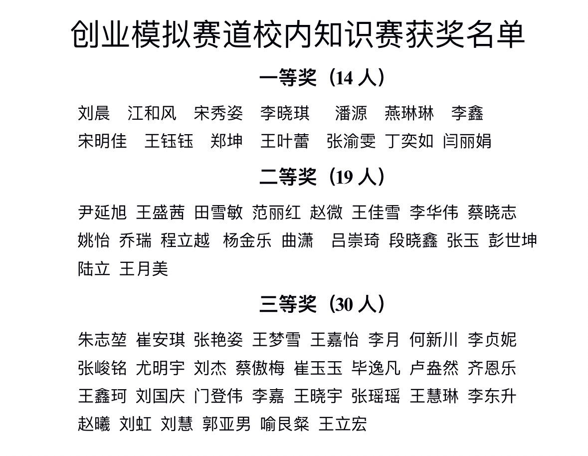 此次竞赛经过知识赛、校内选拔赛及山东省总决赛预选赛后,大赛组委会通过组织线上创业软件模拟竞赛,根据各参赛团队成绩,评选出山东省总决赛本科组(含研究生组)一等奖138项、二等奖183项和三等奖136项。公司获得一等奖的3支队伍晋级全国总决赛。公司知识赛于4月13日进行,共计143名同学参加了线上知识赛答题。14名同学获得校赛一等奖,19名同学获得二等奖,30名同学获得三等奖。在平台模拟校内选拔赛阶段,27支团队参加了比赛,根据平台软件竞赛得分优选出10支队伍角逐山东省总决赛。