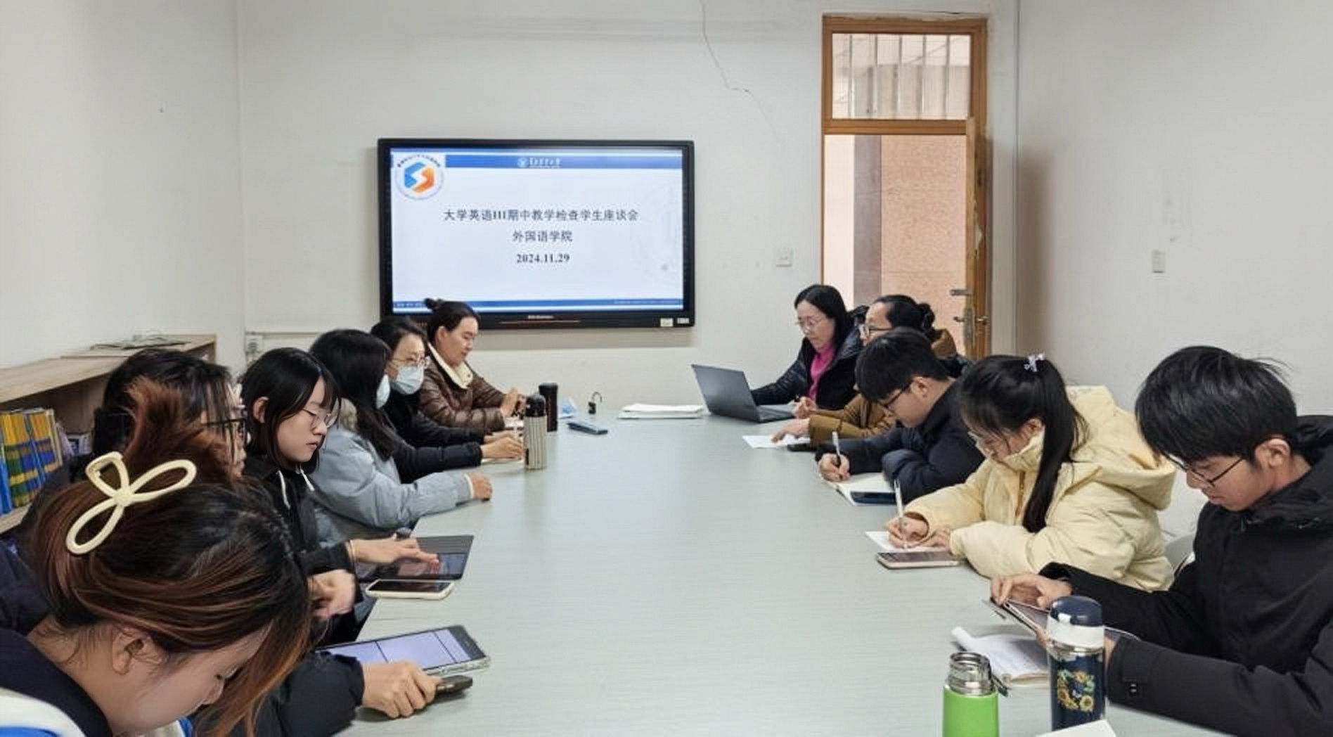 2024年11月29日,大学英语第二教学部在文经楼B203举行大学英语期中教学检查员工座谈会,座谈会由大学英语第二教学部副主任邹秋娟主持,教学部骨干教师刘金玲、崔春燕、杜瑞杰、蒲艳春、朱丽萍以及各个公司员工代表参加。