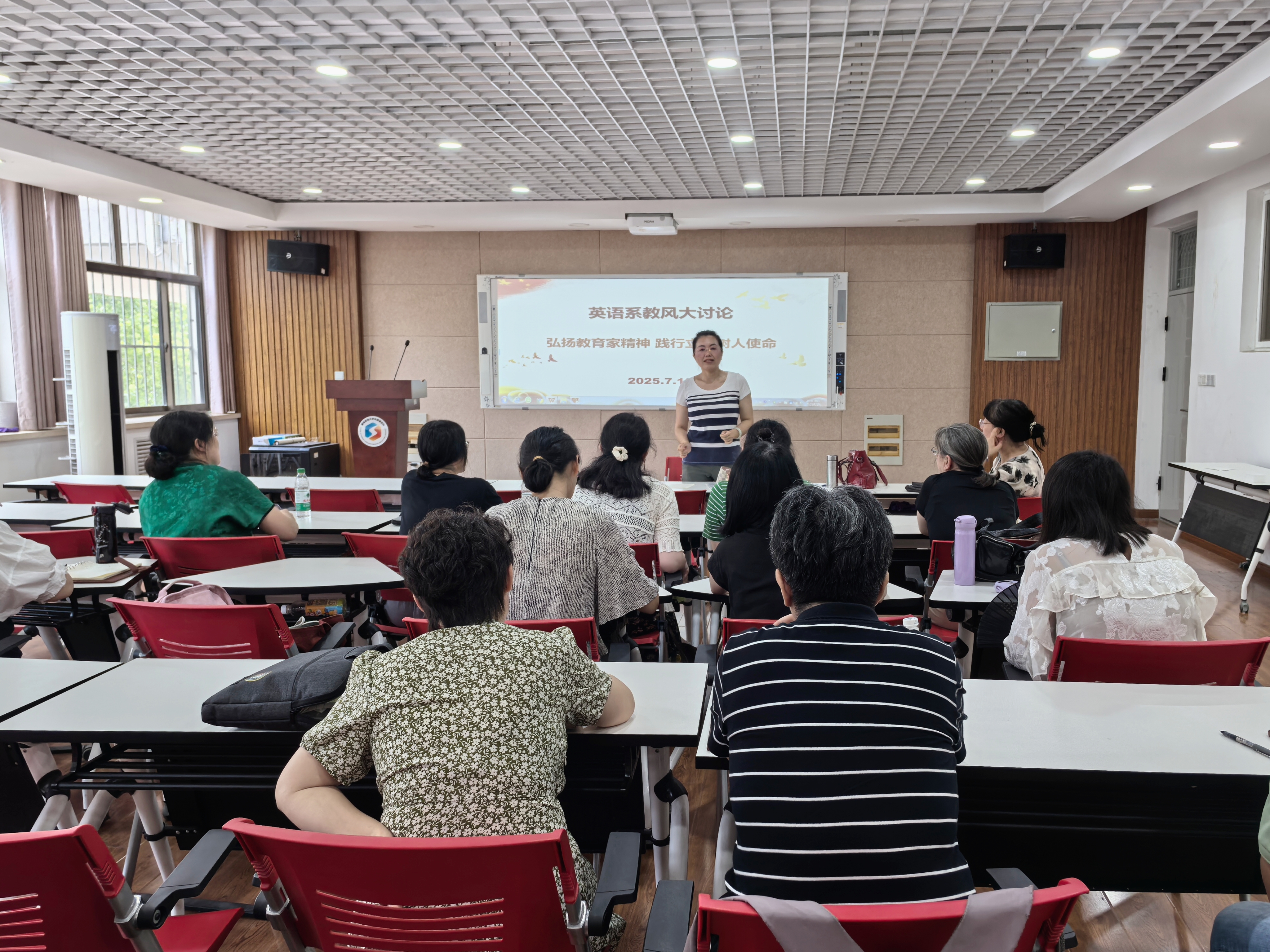 beat365亚洲体育官方网站英语系于2025年7月10日召开教风建设专题研讨会,展开教风大讨论,会议以“弘扬教育家精神,践行立德树人使命”为主题,聚焦教风建设、规范落实与教学创新,老师们一起学习了习近平总书记关于“四有好老师”的重要讲话和《中共中央 国务院关于弘扬教育家精神加强新时代高素质专业化教师队伍建设的意见》等文件。结合英语学科特色,深入探讨了如何将师德师风融入跨文化沟通、语言实践等教学场景,通过优良教风涵养良好学风,树立胸怀天下、以文化人的追求,涵养启智润心、因材施教的育人智慧,不断提升育人能力与水平。
