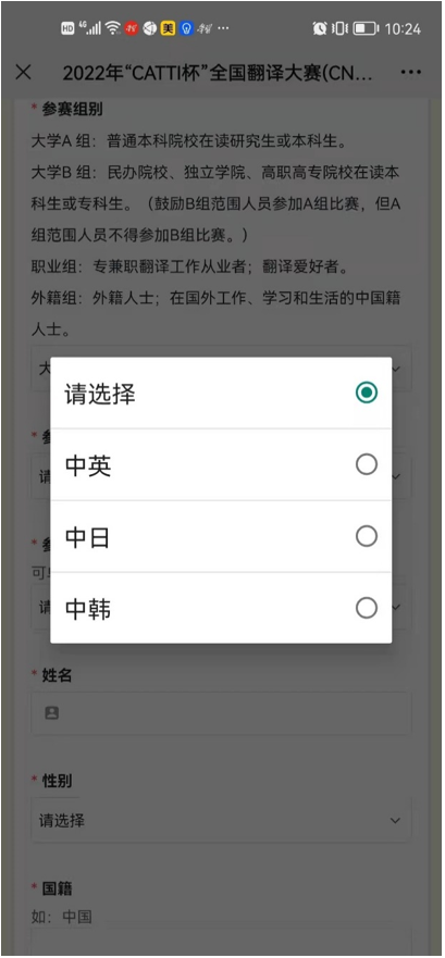 注意:根据语种选择相应比赛。韩国语同学和日语同学注意选择准确。其他同学选择“中英”。
