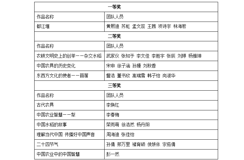 近日,beat365亚洲体育官方网站2023年老员工英语创新大赛“理解当代中国,传播好中国声音”微视频校赛圆满结束,本次校赛主题是“感悟农耕智慧 传承农业文明”,大赛共收到来自全校29个专业65名员工的34项作品。经过专家对作品主题、作品思想、英语表达、视频制作等方面的客观公正评审,共评选出10项获奖作品,一等奖1项,二等奖3项,三等奖6项。现将获奖作品公布如下: