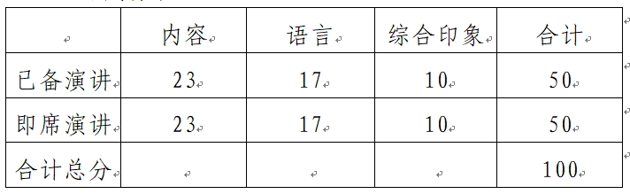 2.即兴演讲:2分钟,选手将当场抽题,拥有1分钟的准备时间,准备时间结束后完成即兴演讲。