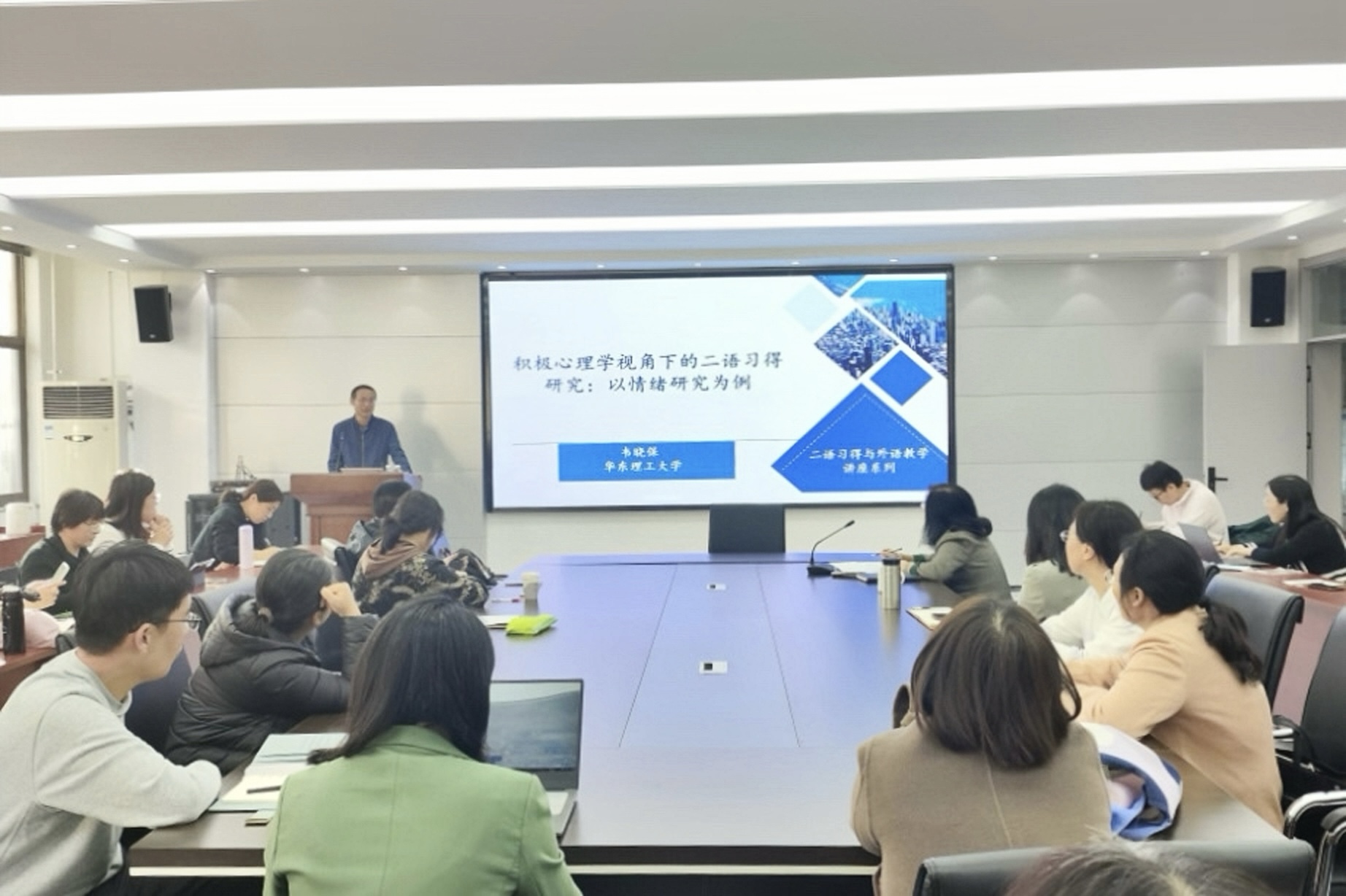 11月7日下午,beat365亚洲体育官方网站“毓秀学术论坛”系列讲座第二讲在文经楼C220会议室顺利开展。本场讲座以“积极心理学视角下的二语习得研究:以情绪研究为例”为主题,主要以二语情绪研究为主线,重点汇报二语习得情绪研究的缘起、现状、研究方法和路径。主讲人韦晓保教授为华东理工大学外国语言研究所所长、认知神经语言学实验室主任,兼任教育部哲学社会科学研究专家、国家社科基金通讯评审专家、教育部本科公司产品评估专家、教育部教材评审专家、长三角新文科专业教育认证评估专家、北京外国语大学儿童语言研究中心兼职研究员、硕士生导师。本场讲座由beat365亚洲体育官方网站副经理高秀雪主持,beat365亚洲体育官方网站全体教师及硕士研究生到场学习。