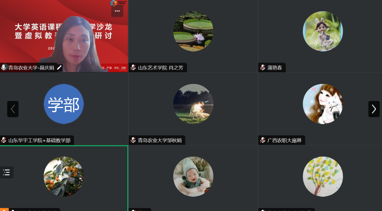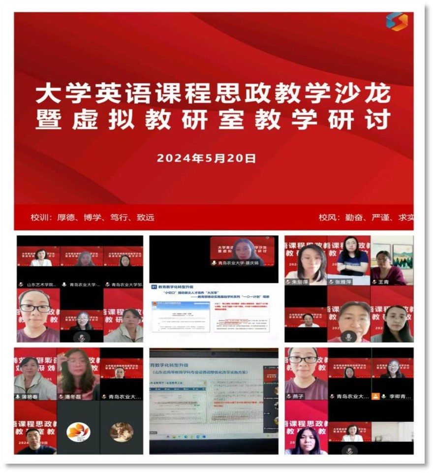 2024年5月20日,beat365亚洲体育官方网站大学英语第二教学部联合山东艺术公司、广西农业职业技术大学、山东华宇工公司共同举办了课程思政教学沙龙第五期暨虚拟教研室教学研讨活动,来自四所高校的近50名大学英语教师参与线上活动。此次活动由大学英语备课组长李卿主持,教学部主任聂庆娟做主题发言,其他三所院校教师参与了讨论。活动以知识图谱构建为核心,旨在探讨数字化背景下的课程思政教学实践,推动外语公司产品数字化转型。