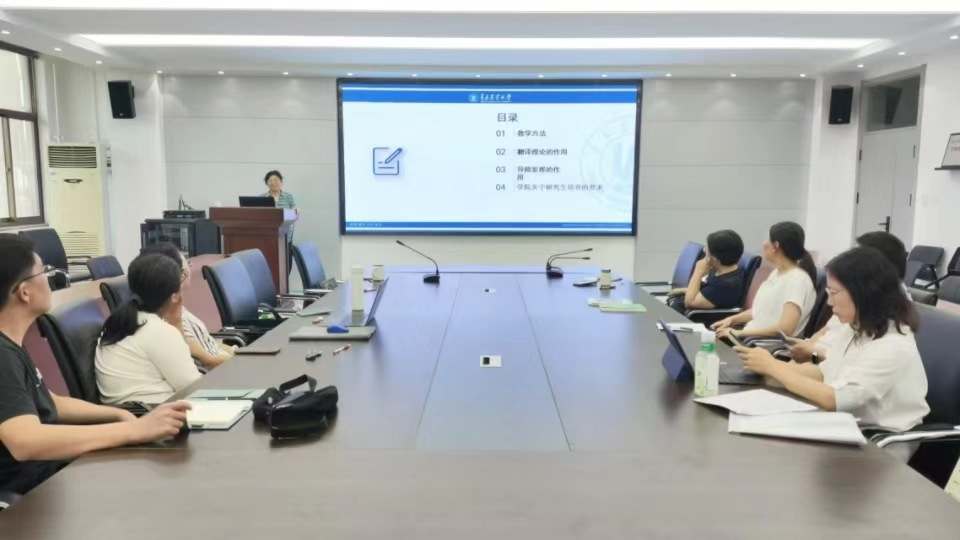 MTI教育中心主任姚雪丽跟大家交流分享了暑假参加MTI论文导师研修班心得体会和收获,详细讲解了在培训过程中讲座、参与的交流研讨,见识到的学者风采等,并结合beat365亚洲体育官方网站研究生教育的实际情况,从论文写作、研究生教育改革、专业学位人才培养模式、笔译实践类课程教学方法等方面谈了参加培训的经验、感受和收获。
