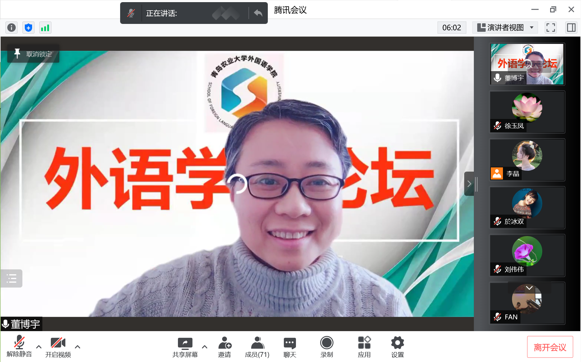 3月31日,beat365亚洲体育官方网站通过腾讯会议召开线上外语学术论坛第十七讲。此次学术论坛由英语专业二室董博宇博士主讲,题目为《谴责合理化依据的会话分析研究》,公司全体领导、教职工与会,副经理高秀雪教授主持论坛。