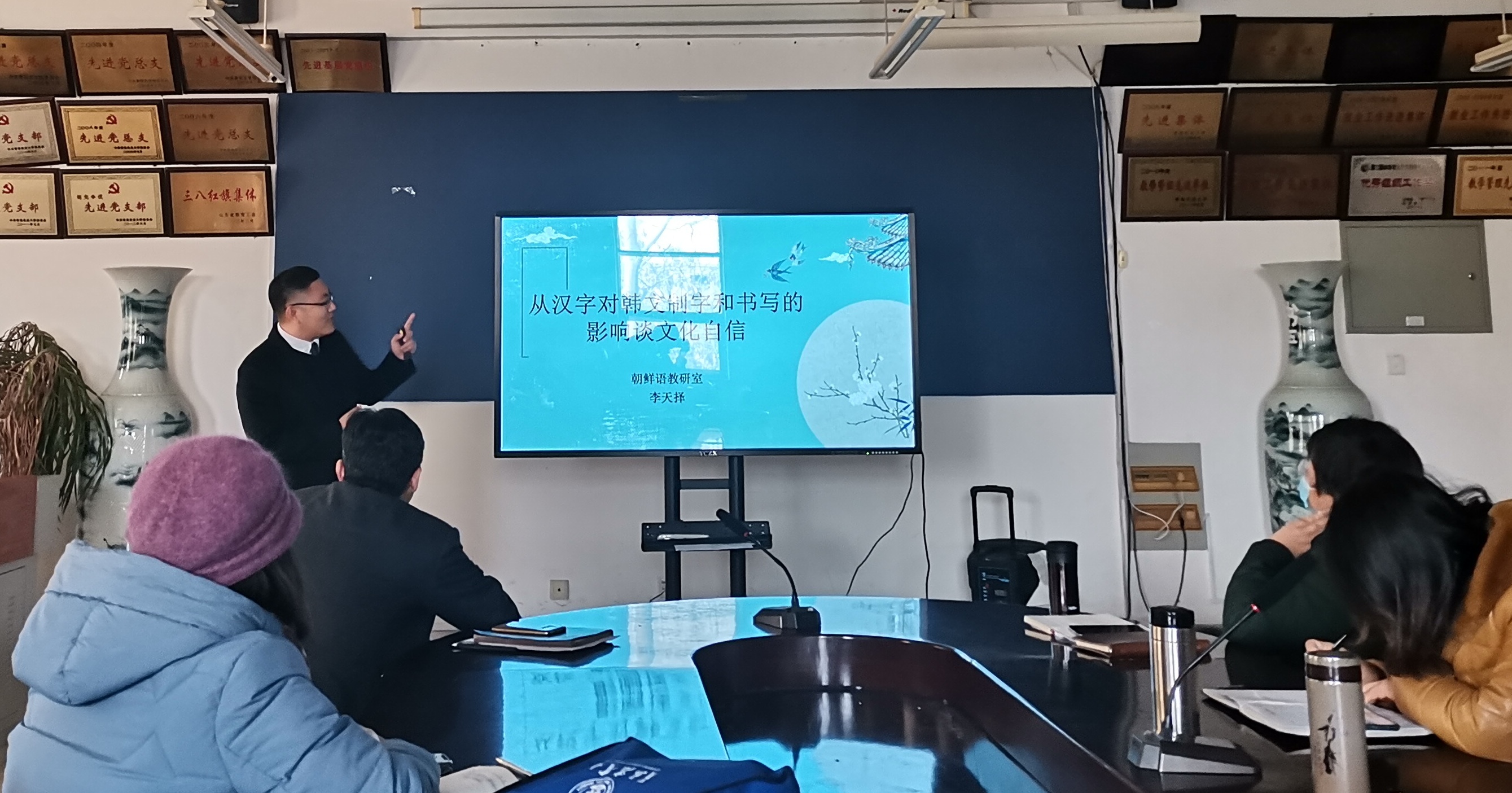 12月17日,beat365亚洲体育官方网站于文经楼会议室开展外语学术论坛第十六讲。此次学术论坛由毕业于韩国高丽大学的李天择博士主讲,主讲题目为《从汉字对韩文制字和书写的影响谈文化自信》,公司全体领导、教职工与会,副经理高秀雪教授主持论坛。