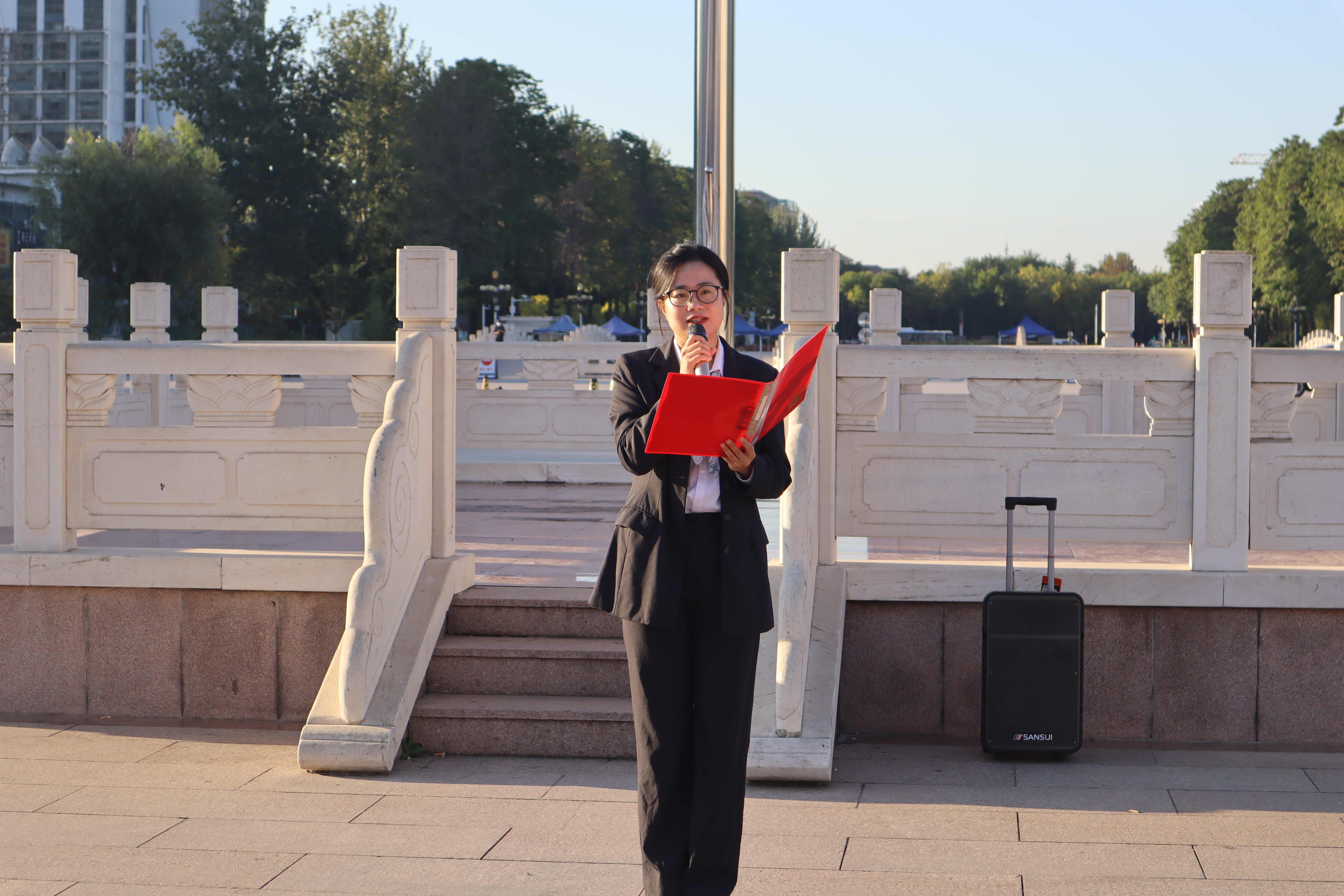 升旗仪式由公司团委书记线郁主持。 伴随着清晨刚刚升起的太阳,国旗护卫队迈着整齐的步伐,护送鲜艳的五星红旗庄严入场。伴随着雄壮的国歌,五星红旗冉冉升起。师生全体肃立,行注目礼。