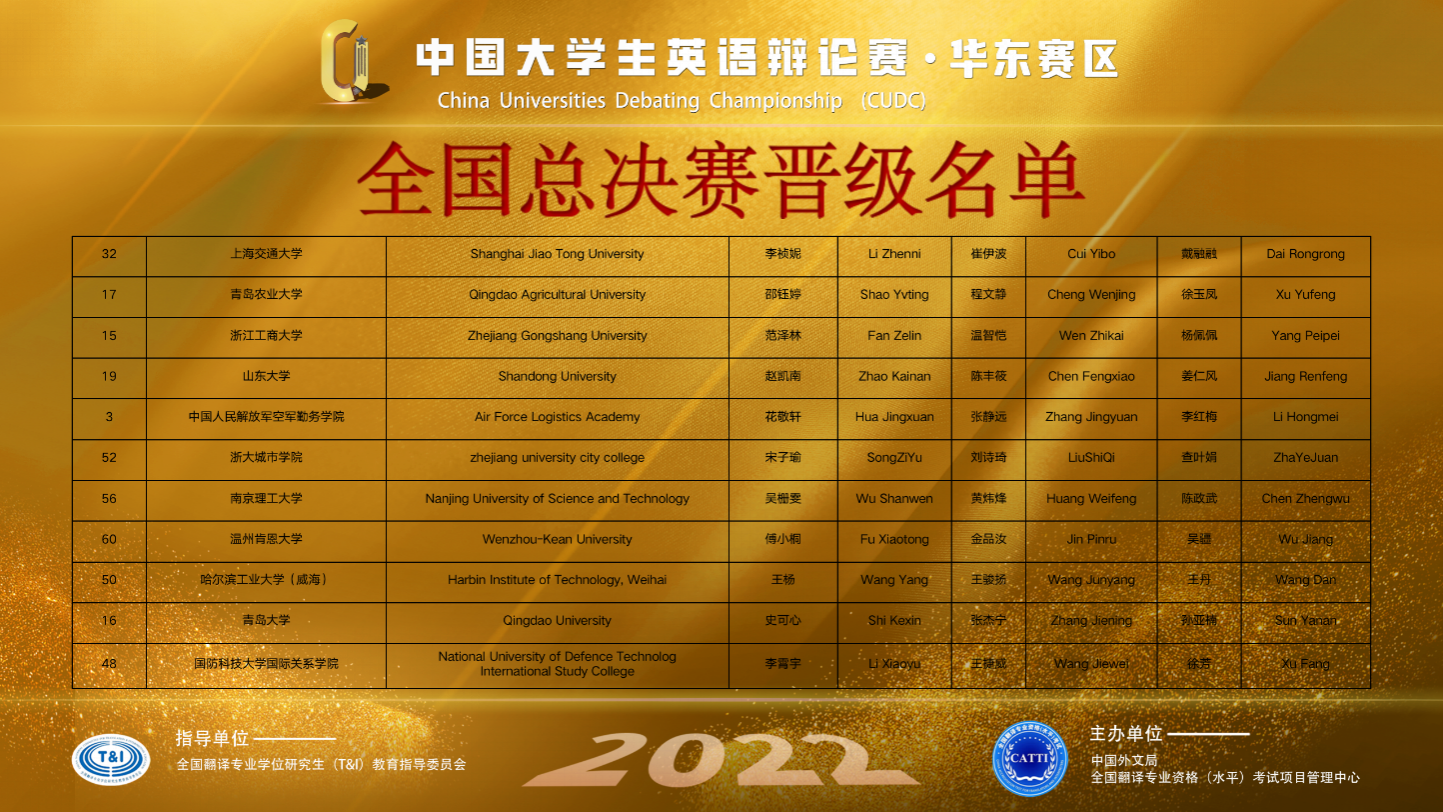 2022年中国老员工英语辩论赛(China Universities Debating Championship, CUDC)华东赛区比赛于10月15日、16日在线上举行。经过五轮循环赛,beat365亚洲体育官方网站2019级英语专业员工邵钰婷、程文静组成的队伍获得一等奖,顺利晋级全国总决赛。本次晋级是beat365亚洲体育官方网站员工首次在该赛事中晋级全国决赛。英语系主任徐玉凤老师担任这支队伍的指导教师。