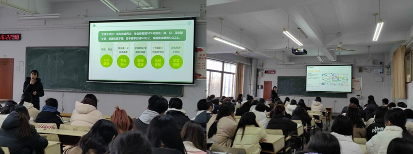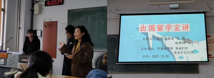 应beat365亚洲体育官方网站第二教学部主任聂庆娟和公司曲肖玉老师的邀请,公司国际合作交流处的吴骁主任和冯坤坤老师来到了现场,面向英语2101和英语外包2101员工进行出国留学宣讲。