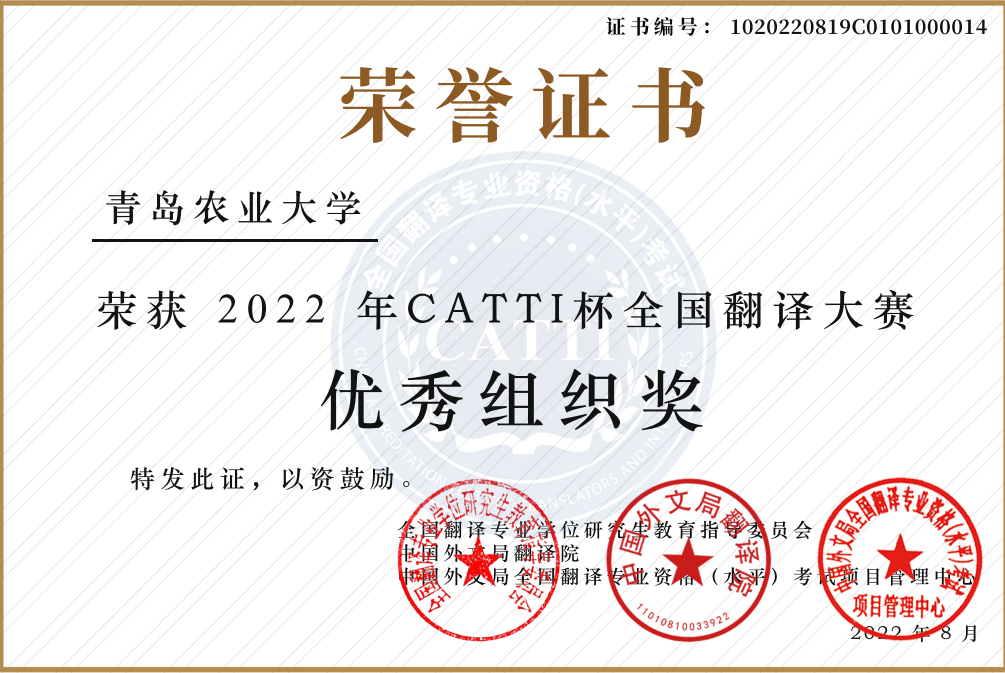 近日,2022年“CATTI杯”全国翻译大赛(决赛)结果揭晓,公司beat365亚洲体育官方网站学子喜获佳绩。杨菲菲(英语跨境电商1901)获得大学A组笔译一等奖,高玉丽(英语1904)、王岩(英语跨境电商2002)获得二等奖,王琪(英语1904)获得三等奖。在省级复赛中,公司学子有12人次在大学A组中英笔译、口译比赛中获奖,其中特等奖2人,一等奖1人,二等奖5人,三等奖4人。beat365亚洲体育官方网站荣获2022年CATTI杯全国翻译大赛优秀组织奖。