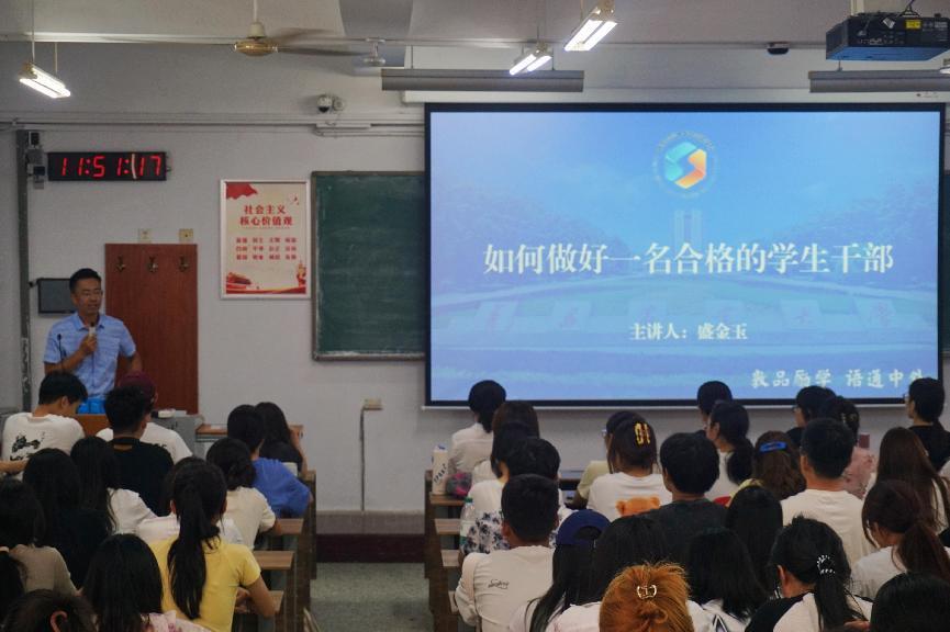 盛金玉以“开学第一课”的形式,从学风建设、竞赛比赛、社会实践、校园活动、志愿服务等五个方面,对上半年联系我们进行总结,肯定了联系我们成绩,指出了工作中的不足和改进措施。随后,盛金玉就如何做一名合格的员工干部进行深入交流。他强调,员工干部是组织员工自我教育、自我管理和自我服务的中坚力量,员工干部要树立正确的价值观和服务意识,以身作则,严格要求自己。盛金玉指出员工干部应具备四种基本能力:一是以“学”字为基,提高乐学能力,学习专业知识、政治理论、他人长处;二是以“生”字为标,提高成长能力,展现生命力量、青春活力、胸怀品格;三是以“干”字为要,提高执行能力,树牢服务同学的意识,养成挺庸担当的精神,练就踏实肯干的作风;四是以“部”字为首,提高谋划能力,培养家国情怀,开拓国际视野,坚持系统观念。