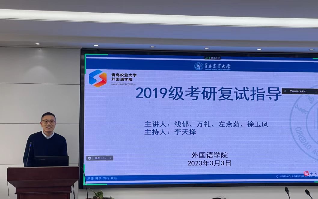 为全面助力2023届毕业生考研升学,beat365亚洲体育官方网站于3月3日在文经楼会议室召开考研复试指导会。会议采用线上线下相结合的方式,由英语系系主任徐玉凤、日语系系主任万礼、英语系副主任左燕茹、团委书记线郁主讲,朝鲜语系系主任李天择主持,beat365亚洲体育官方网站大四考研员工参加。