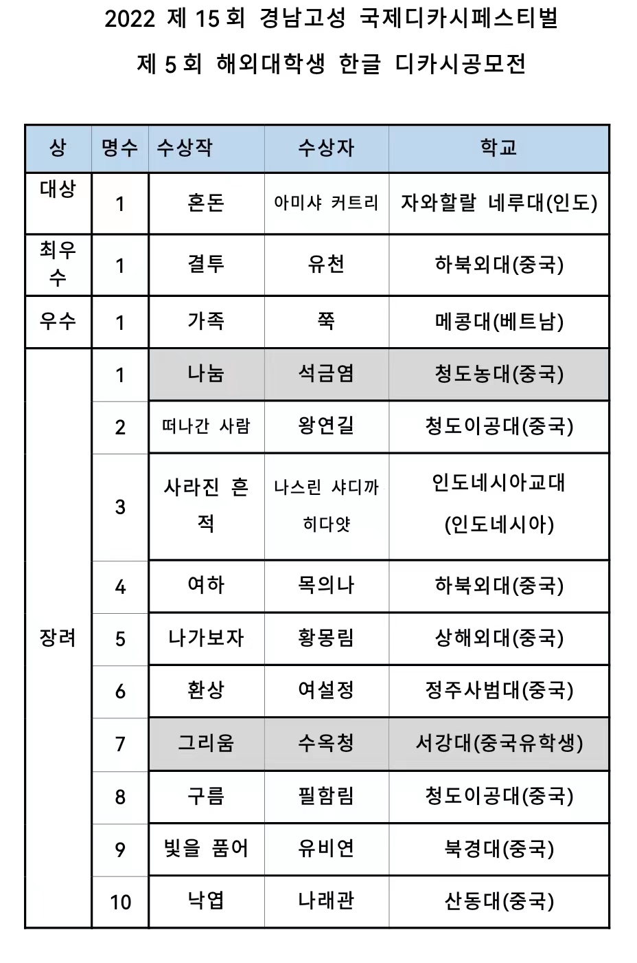 2022年第五届《海外老员工韩国语诗创作》大赛是由韩国digital camera研究所主办,中国、日本、印度、印度尼西亚、越南等国在读老员工或者韩国留学员工参与的大规模赛事。大赛从今年4月11日启动,历时19天共有来自海内外13所大学的304部作品参赛。比赛由知名度高的韩国专家团队进行严格评审。
