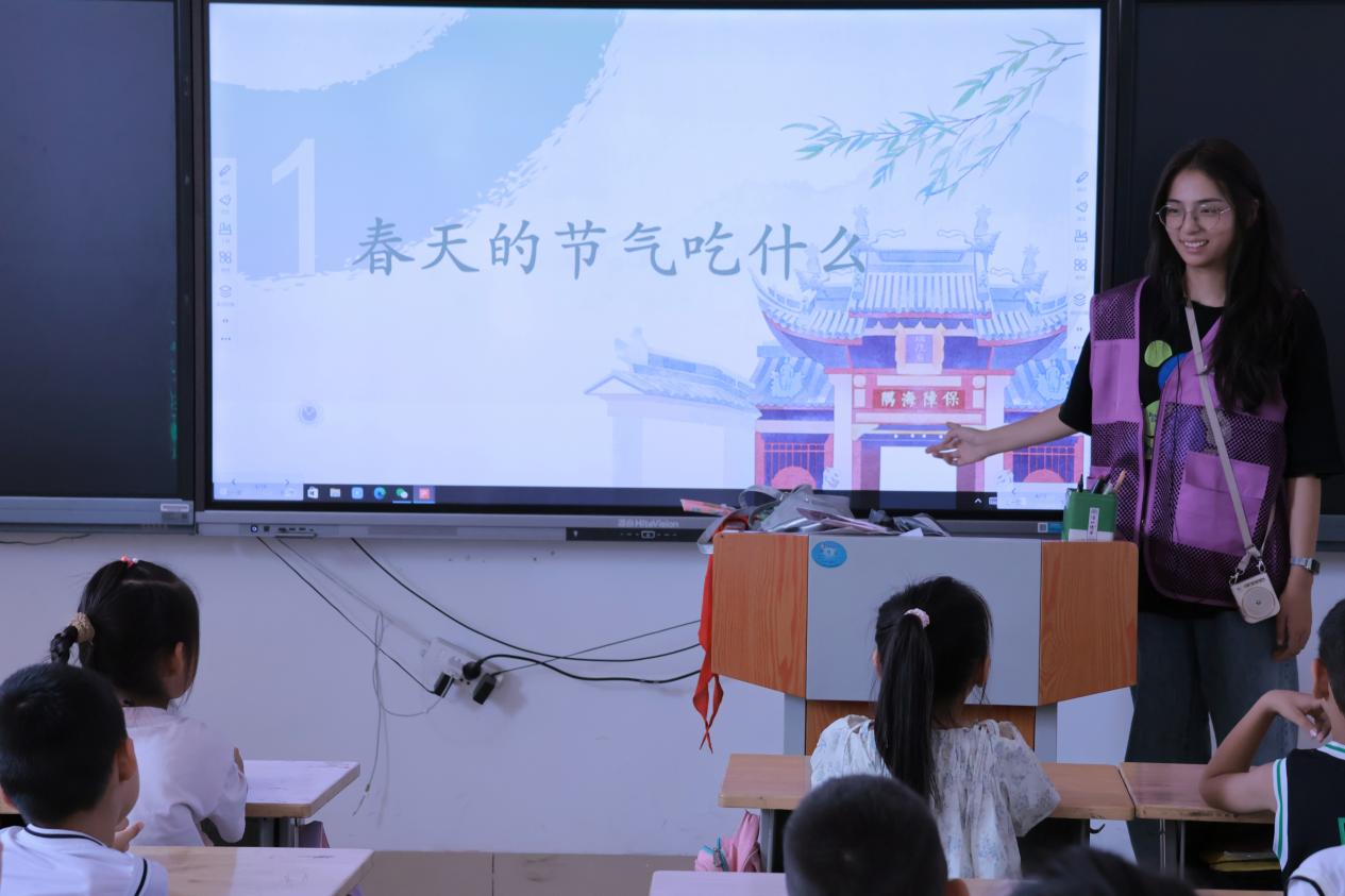 二十四节气是中国古代农耕文明的产物,它不仅指导了农业生产,还对人们的健康养生、文化传承等产生了深远的影响。实践团踏入潍坊市军埠口镇幼儿园,精心策划了一场节气饮食文化和外语普及活动。“小朋友你们知道立春时该吃什么食物吗?”实践团成员杨佳文祺手持节气图谱,循循善诱,从节气与食物的关系讲起,用温柔的话语,为员工讲述节气的故事和相关的饮食文化,并以二十四节气为载体结合外语专业,普及简单的节气英文词汇,丰富小朋友们的体验。