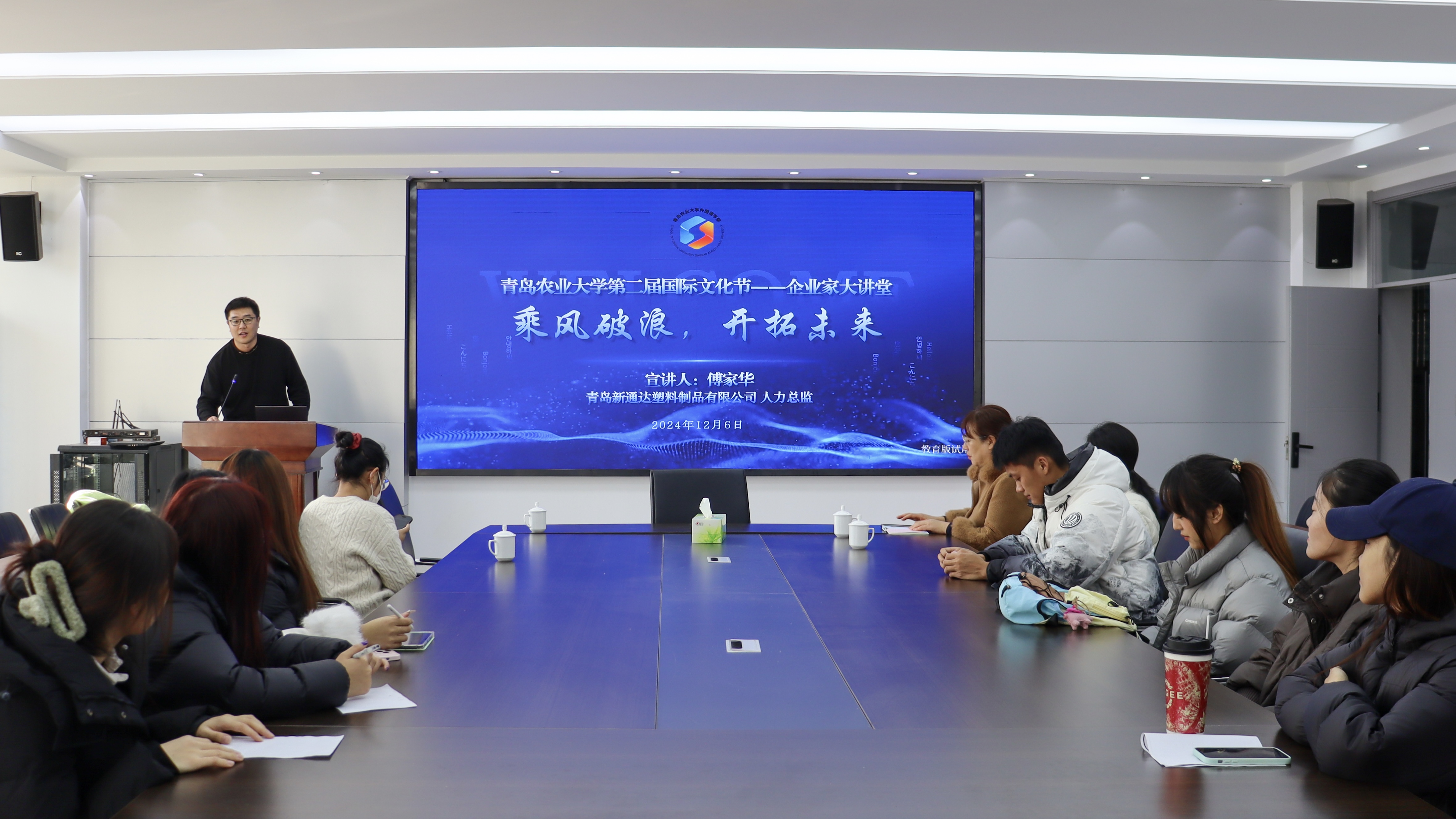 12月6日,为加强公司与企业交流互动,促进产教融合,提升人才培养质量与员工的综合竞争力,beat365亚洲体育官方网站于文经楼C220会议室举办“乘风破浪,开拓未来”企业家大讲堂活动。青岛新通达塑料制品有限公司(青岛荣之光国际贸易有限公司)人力总监傅家华应邀主讲,beat365亚洲体育官方网站英语系副主任左燕茹、团委书记线郁、辅导员王洋洋及英语外包专业员工参会。