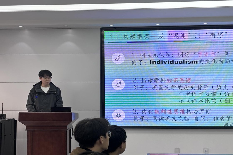 分享会上,张闰杰主要围绕三大核心板块展开讲解,一是提升思维方式,提出构建学科知识图谱、实现知识“输入-内化-创造”转化、培养批判性思维的实用方法。二是改善学习方法,结合四六级、专四专八等考试,分享目标设定、以考促学及听说读写针对性训练技巧。三是分享竞赛经验,详细解读“21世纪杯”演讲比赛、CATTI杯翻译大赛等各类赛事的备赛要点。分享结束后,张闰杰还与现场同学展开互动交流,耐心解答大家在学业规划、竞赛参与等方面的疑问。