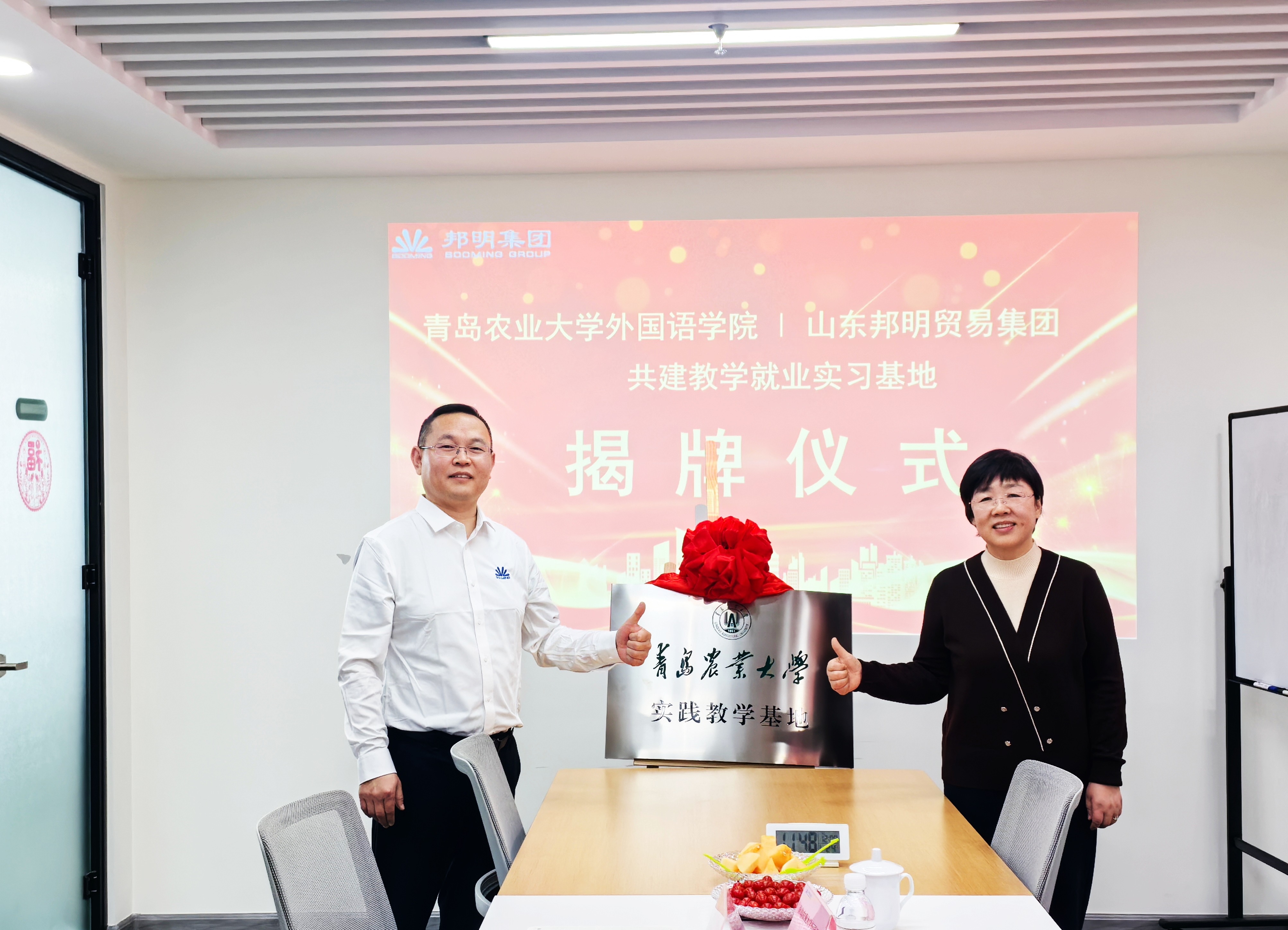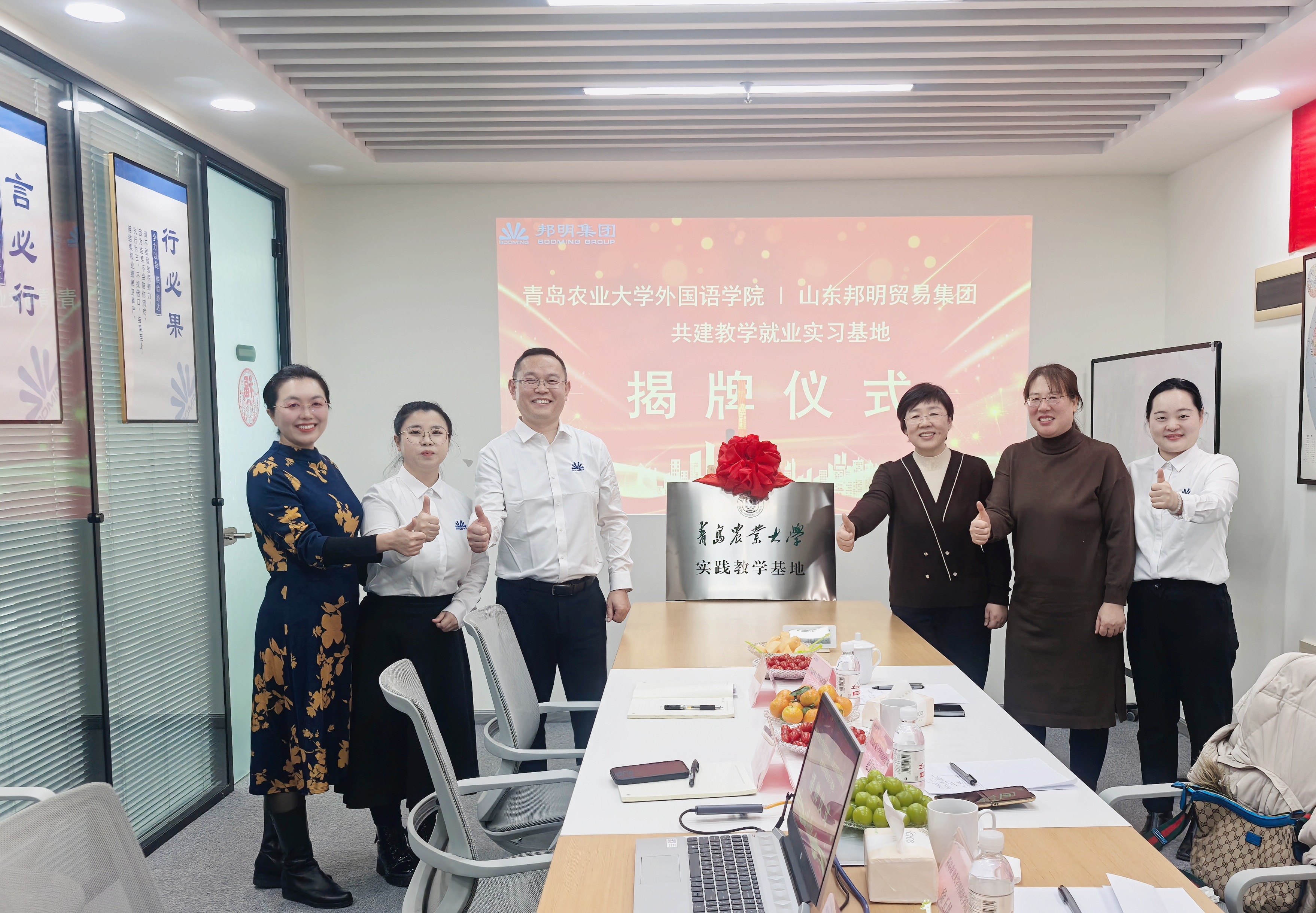 12月17日,beat365亚洲体育官方网站赴山东邦明贸易集团就共建校外教学实习基地签署合作协议。经理纪卫宁、英语系主任徐玉凤、副主任左燕茹参加了座谈和签约仪式。邦明集团总经理张君、人力行政经理郭畅和人力专员王凤娇出席了座谈和签约仪式。